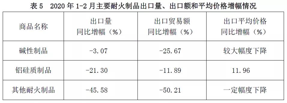 表5是2020年1-2月主要耐火制品出口量、出口額和出口平均價(jià)格變化情況。堿性耐火制品出口量下降3.07%,而出口平均價(jià)格出現(xiàn)較大幅度下降;鋁硅質(zhì)制品雖然出口量下降21.3%,而出口平均價(jià)格大幅增長11.96%;其他耐火制品出口量大幅下降45.58%,出口平均價(jià)格僅下降8.52%。